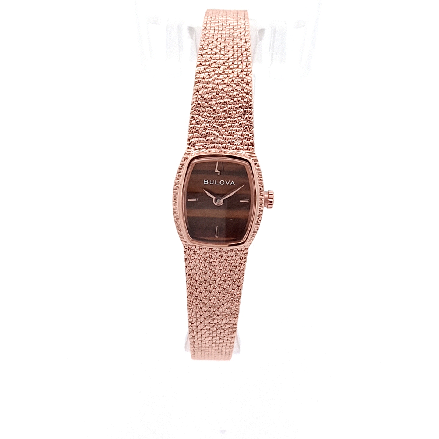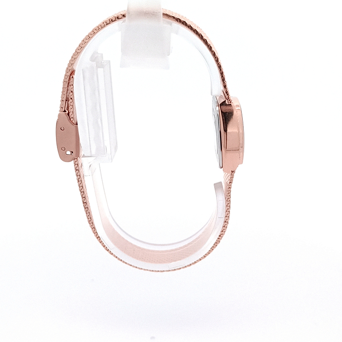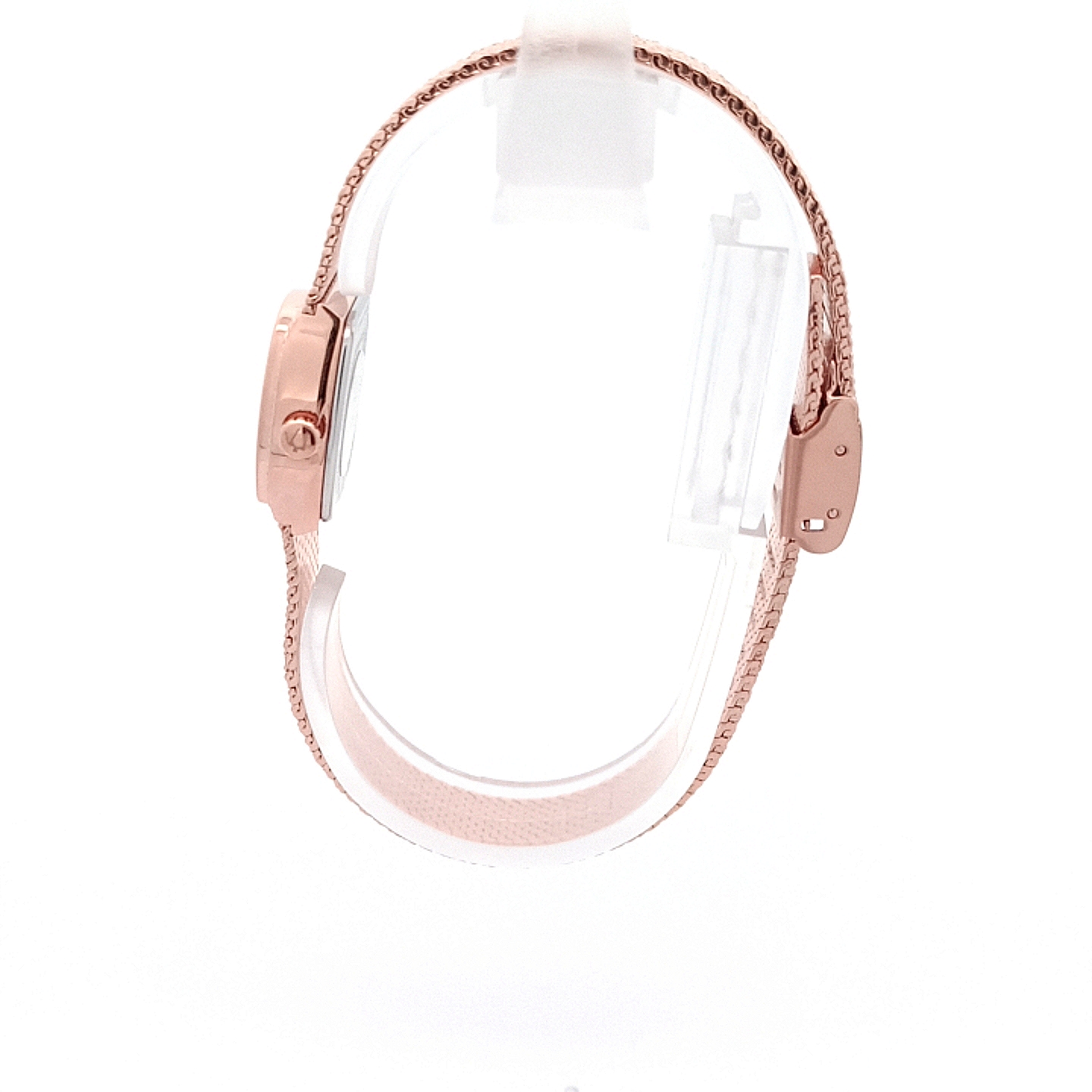 Das Gehäuse aus hochwertigem Edelstahl in warmem Goldton wird durch ein kratzfestes Saphirglas geschützt. Das zarte Armband fügt sich nahtlos an das schlanke, feminine Gehäuse an und sorgt für einen komfortablen Sitz am Handgelenk. Das braune Zifferblatt mit goldfarbenen Akzenten unterstreicht die elegante Ästhetik dieser besonderen Damenuhr.