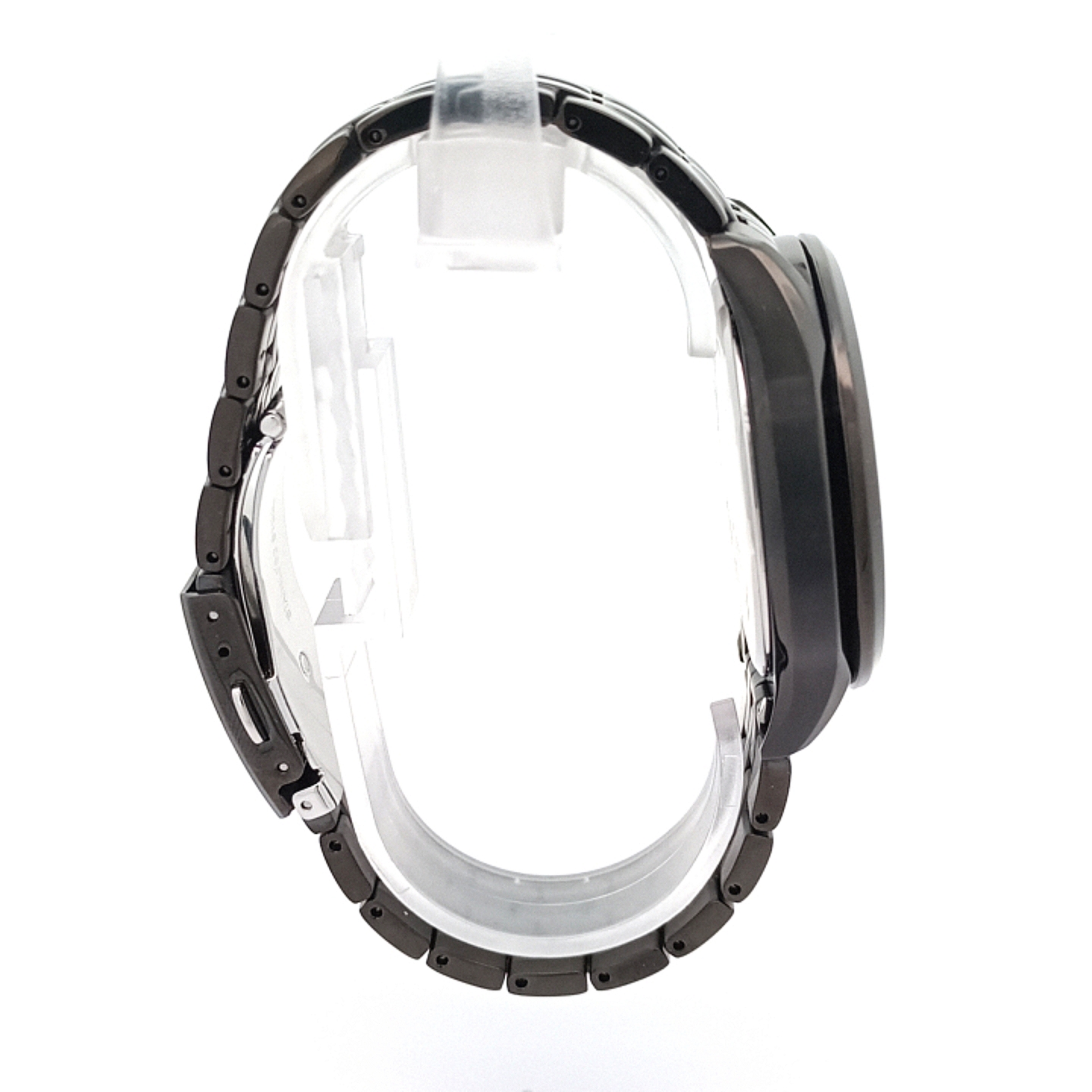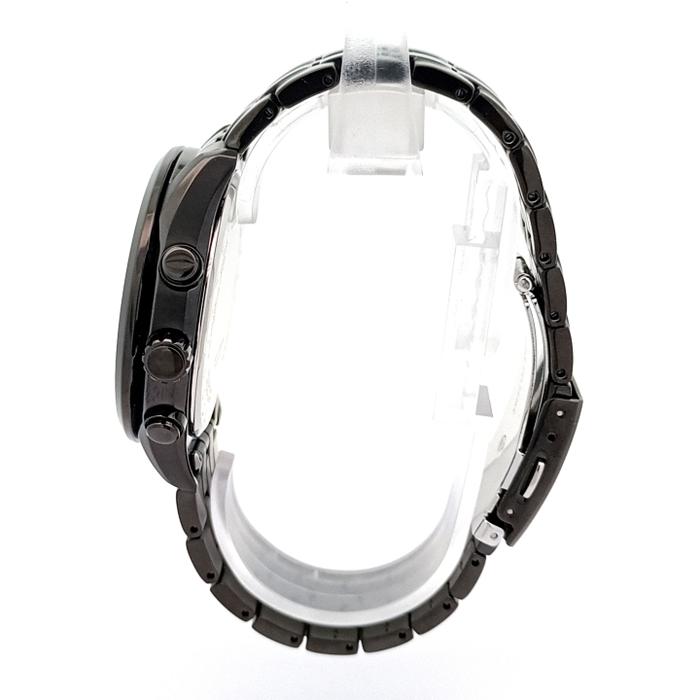Hochwertige Materialien & Verarbeitung: Edelstahlgehäuse mit schwarzer Beschichtung, kratzfestes Saphirglas, schwarzes Edelstahl-Gliederband mit Doppeldrücker-Faltschließe.