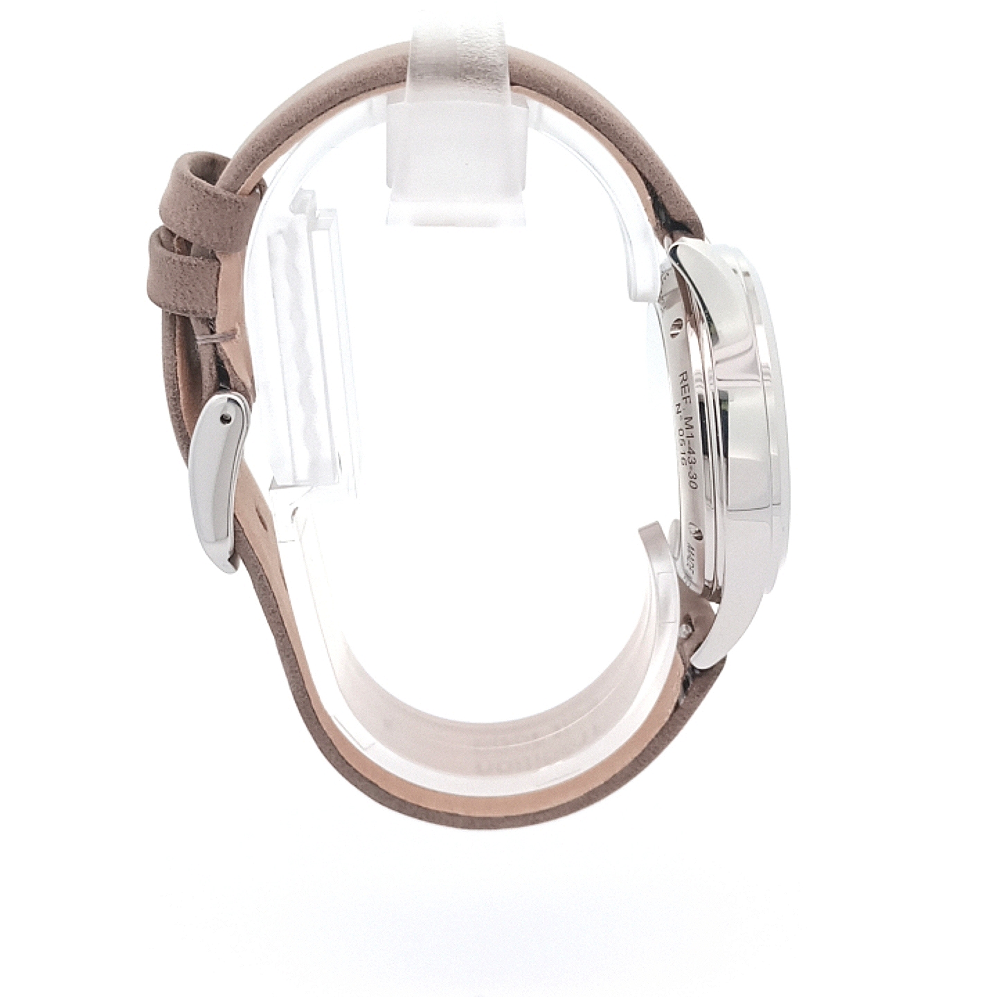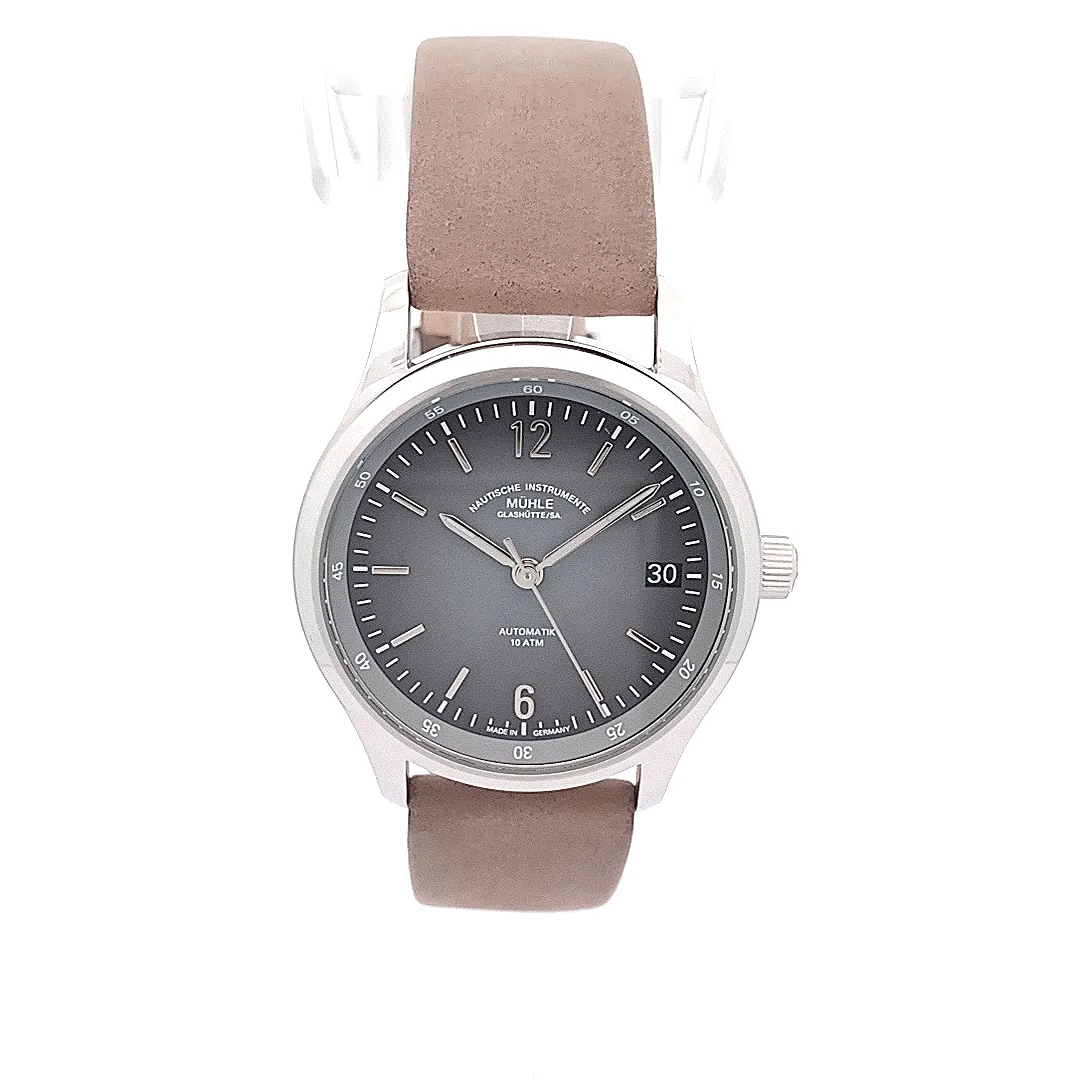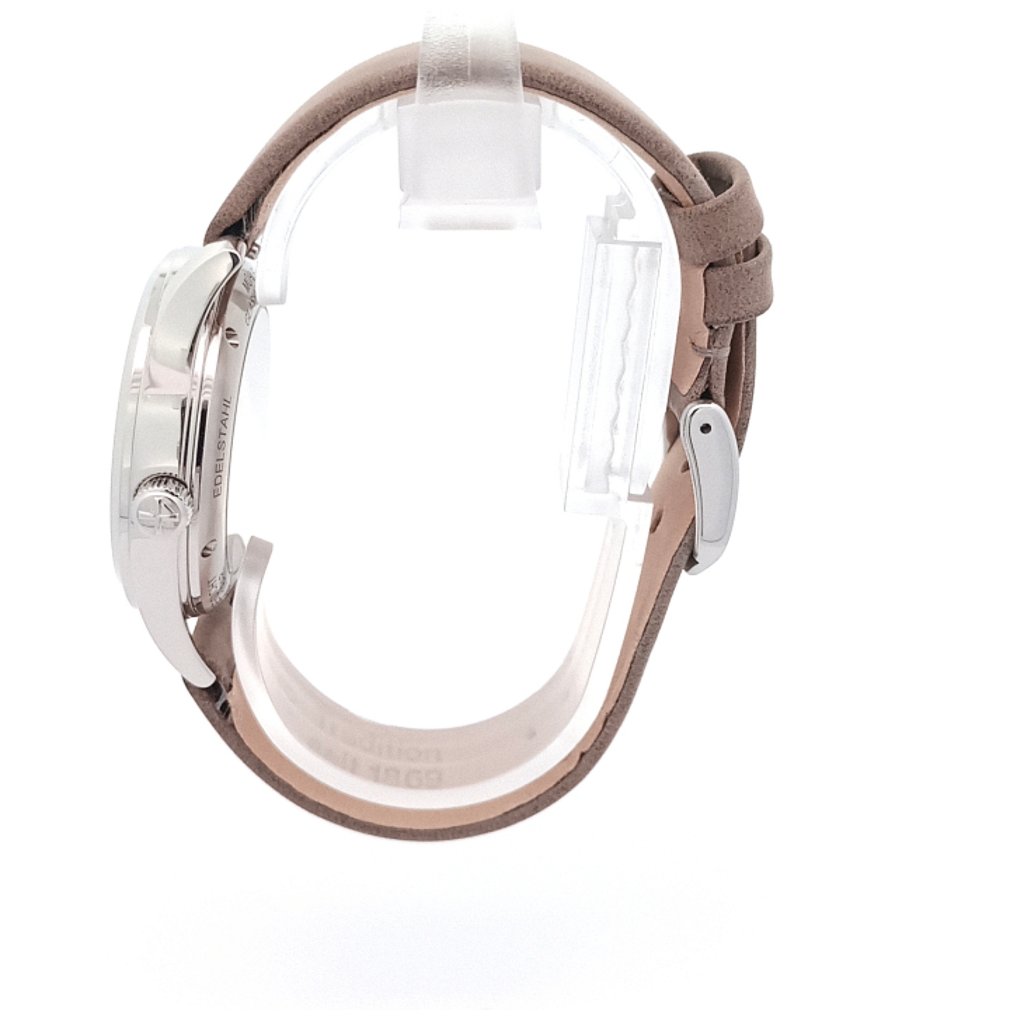 Die Lunova Lady M1-43-36-LB-O vereint feminine Raffinesse mit der charakteristischen Präzision sächsischer Uhrmacherkunst. Ihr Edelstahlgehäuse mit polierten und satinierten Flächen verleiht der Uhr eine moderne, zugleich zeitlos elegante Ausstrahlung. Unter dem entspiegelten Saphirglas schimmert ein edles Schiefergrau Zifferblatt mit applizierten Indizes, das den eleganten Charakter dieser Damenuhr unterstreicht.